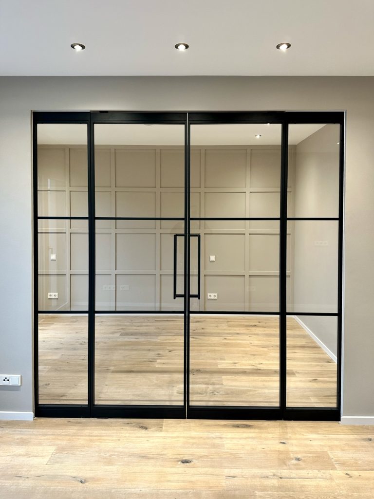 Diese elegante LoftFX-Lösung bringt Struktur und Charakter in den Wohnraum: Eine Doppel-Pivottür mit zwei fixen Seitenteilen trennt zwei großzügige Bereiche – ohne Licht zu nehmen oder die Offenheit des Grundrisses zu stören. Der schwarze Stahlrahmen mit Polo3-Sprossen sorgt für klare Linien, während die schlanken Gracia-Griffe einen stilvollen, dekorativen Akzent setzen. Die raumbreite Verglasung mit Pivotmechanik ist nicht nur funktional, sondern ein architektonisches Highlight – die sprichwörtliche Kirsche auf der Design-Torte.