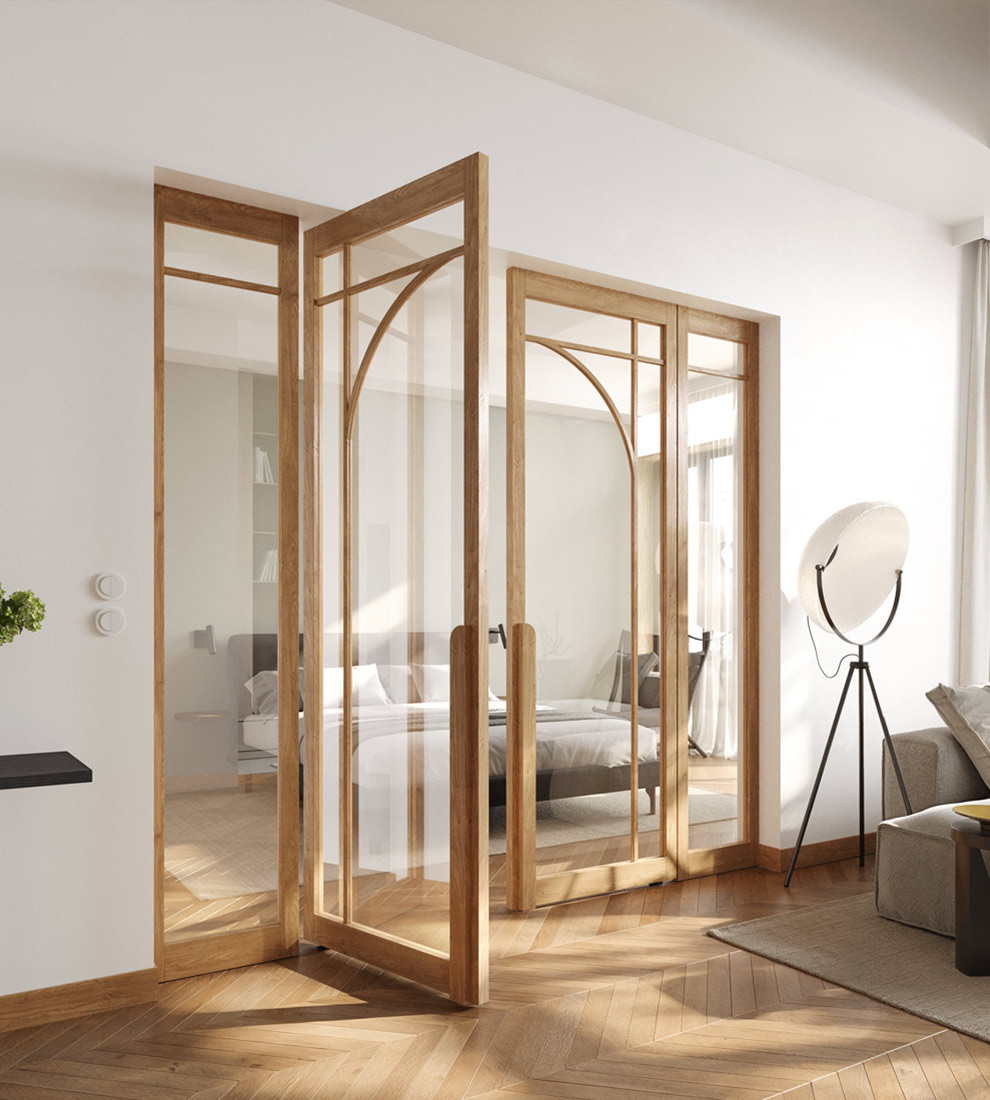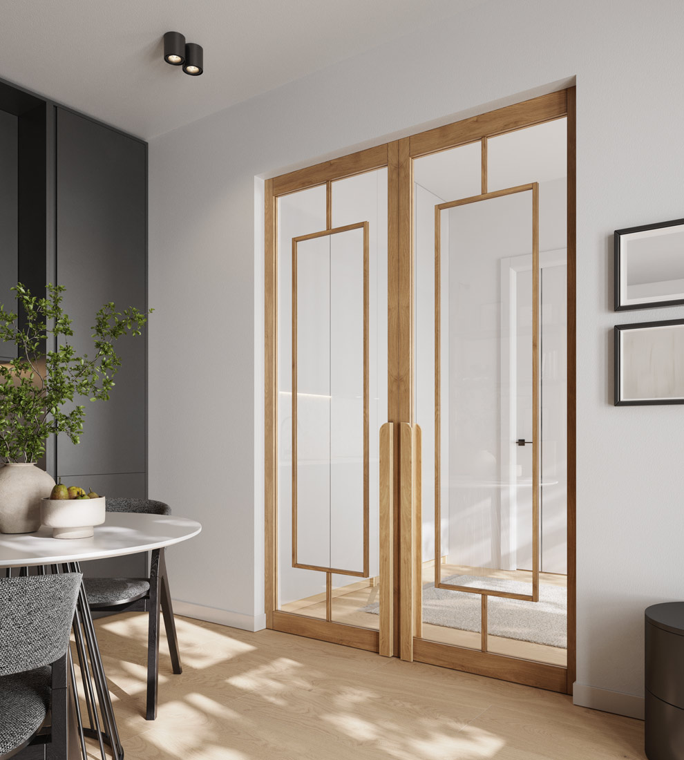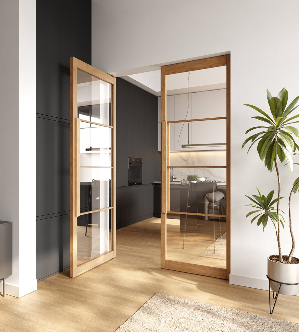Die doppelflügeligen Designtüren aus Holz und Glas verbinden Wohnbereich und Küche mit Leichtigkeit und Stil.